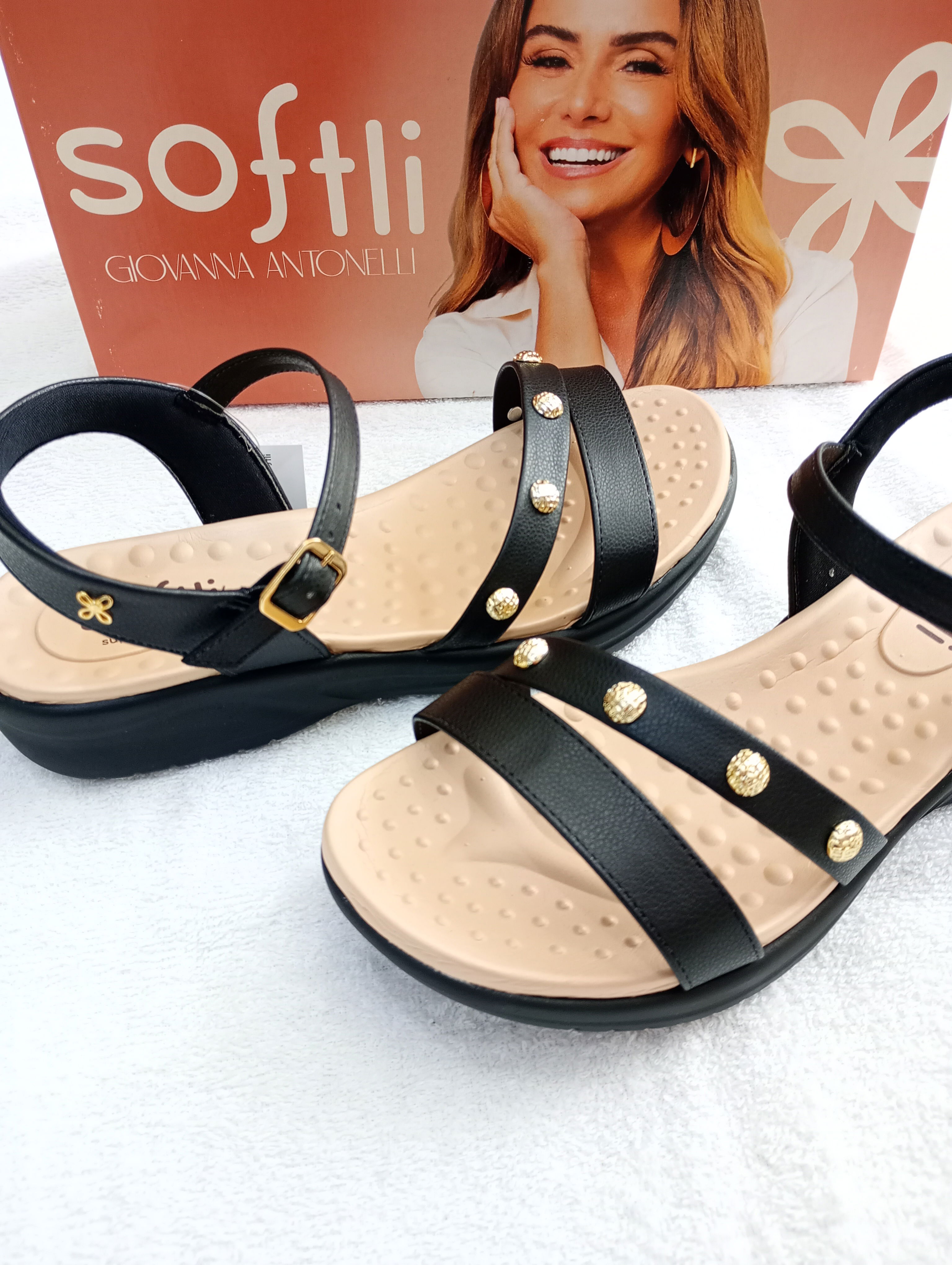 Sandalias marca taco bajo con 2 tiras y detalles en dorado.